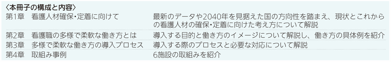 本冊子では、このような意識変革を促すとともに、各組織での看護職の「多様で柔軟な働き方」を導入するために具体的な働き方の例、それに見合った処遇の考え方などを示している。また、実際に導入する際のプロセスや先進的な導入事例や、よくある質問への回答などをまとめた。