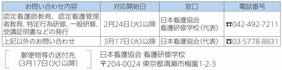 日本看護協会神戸研修センターは、3月16日をもちまして閉所いたします(本紙2025年4月号掲載)。これまで長年にわたり、神戸研修センターの運営にご支援・ご協力を賜りました皆さまに、心より感謝申し上げます。閉所後の研修事業は、看護研修学校(東京都清瀬市)へ統合されます。今後のお問い合わせにつきましては、下記の窓口までご連絡ください。