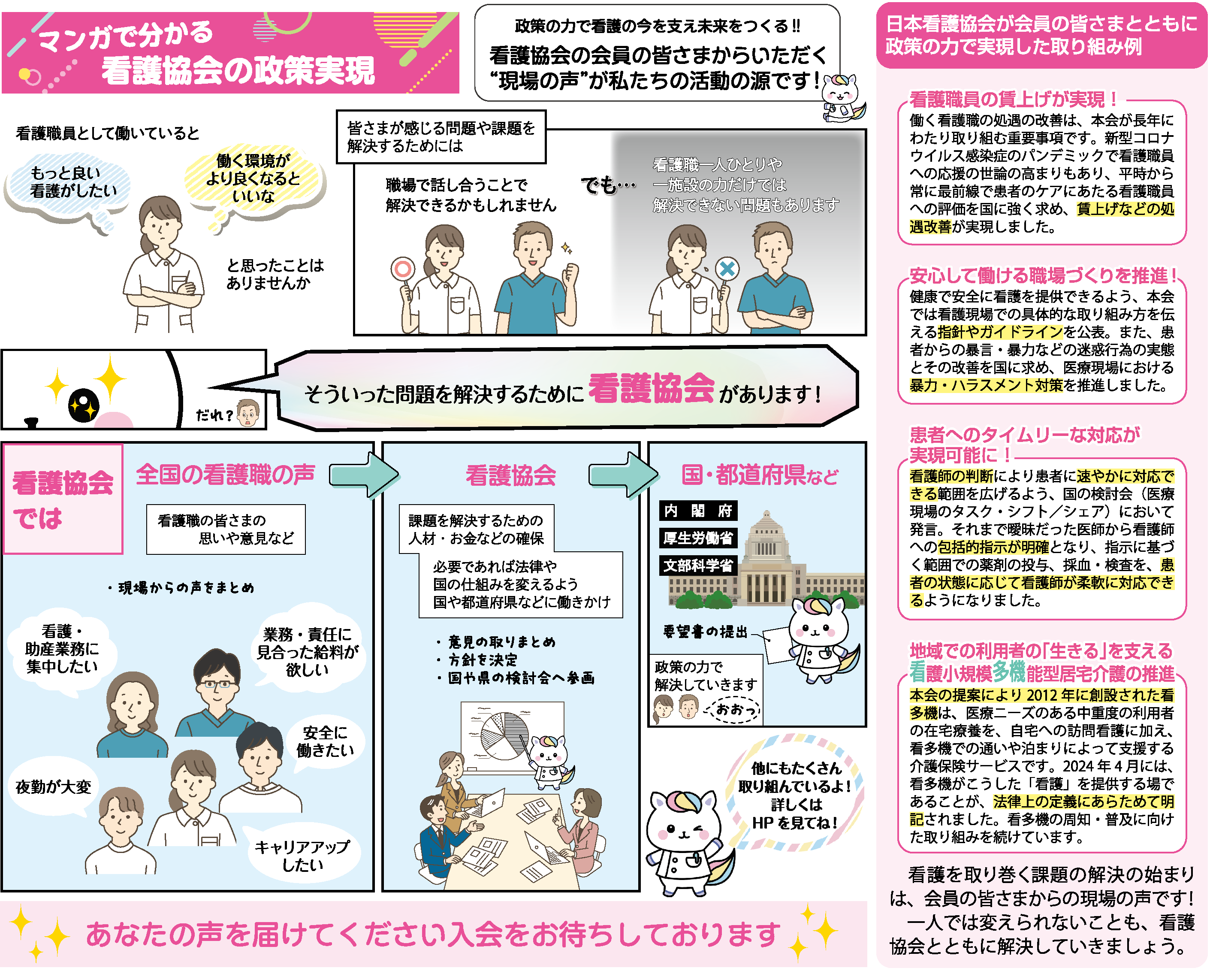 日本看護協会は、都道府県看護協会と協働し、個人の力だけでは解決できない看護を取り巻く課題の解決に向け、