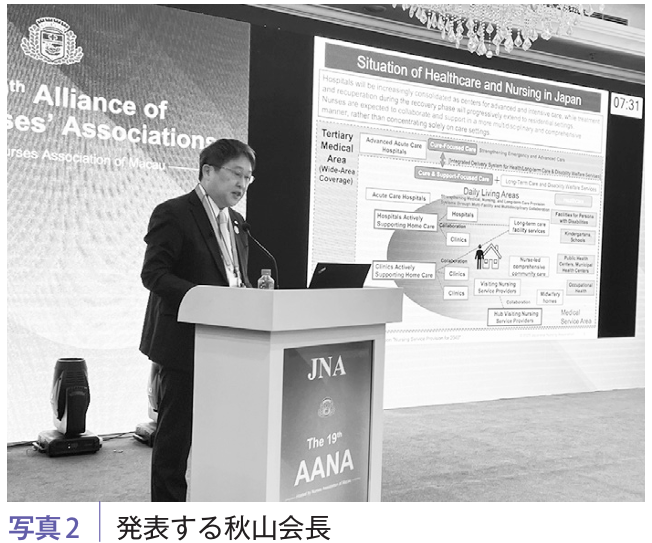 本会からは、秋山会長より「看護の将来ビジョン2040」(※)を紹介するとともに、看護管理者の活躍推進、NuPS構築による看護職のキャリア構築支援、東京大学との社会連携講座の開設など本会事業の報告を行いました(写真2)。