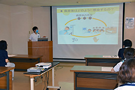 マニュアルは基本知識、外来・病棟での対応、職員の健康管理を柱に2度にわたって改訂。小西さんはこのマニュアルを片手に病棟を走り回る。実際に、新型コロナウイルス感染症疑いが出て現場がパニックになった際には、マニュアルを携帯して現場に駆け付け、参照しながら、やるべきことを具体的に指示していった。「実践でやることと、マニュアルの内容が結び付いて、皆の知識の定着にもつながった」と小西さんは振り返る。また、全職員を対象とした研修会も、3密を避けつつ、1カ月余りで14回行い、対策を伝え続けた。
