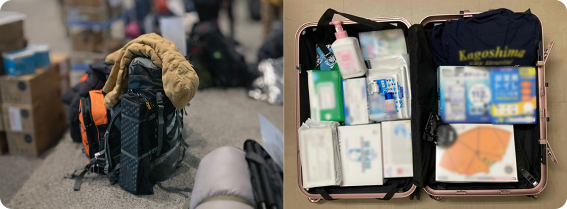 最初の支援では勝手が分からず、県協会のマニュアルにあるものをすべて揃えたところ、1つのリュックでは持ちきれず、2つに分けていきました。冬用衣類などは、県協会が用意してくれた圧縮袋が役立ちました。靴は動きやすさと安全性を考え、登山靴を選んでいます。