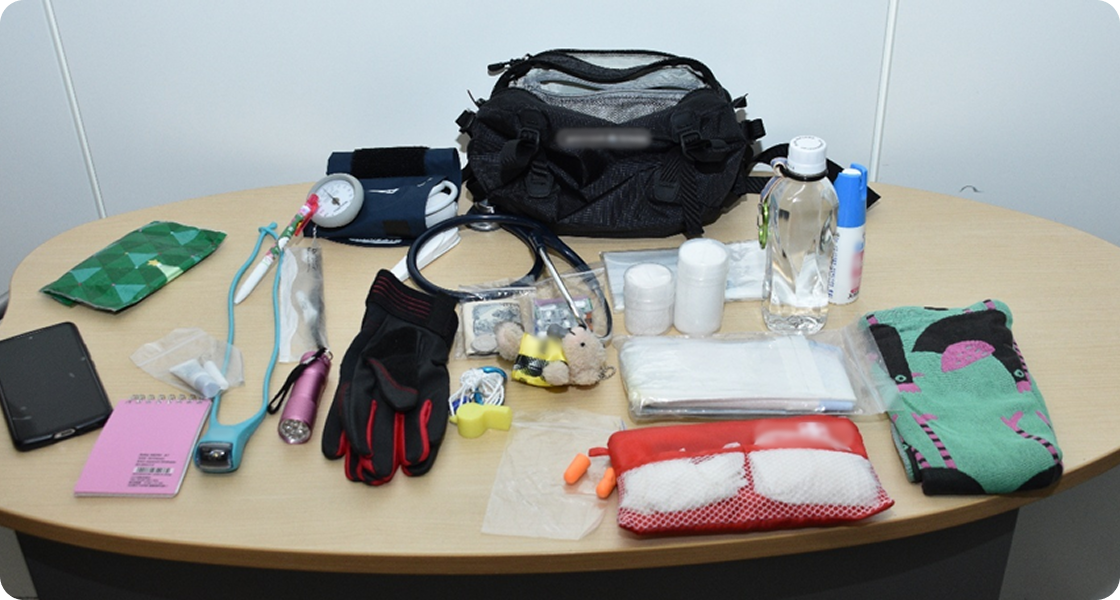 | 活動に必要なもの | 血圧計/聴診器/体温計/首掛けライト/ペンライト/救急セット(滅菌ガーゼ、包帯、使い捨て手袋、ビニール袋、ティッシュ)/作業用手袋/マスク/メモ帳/筆記用具/ぬいぐるみ/スマートフォン/飲料水 |