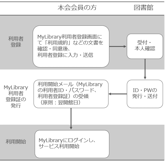 MyLibraryとは、当館に登録をすると使える利用者個人ページのことで、図書の貸出や資料の取寄せなどの利用者サービスが利用できます。最初にMyLibraryに利用者登録をしてください。